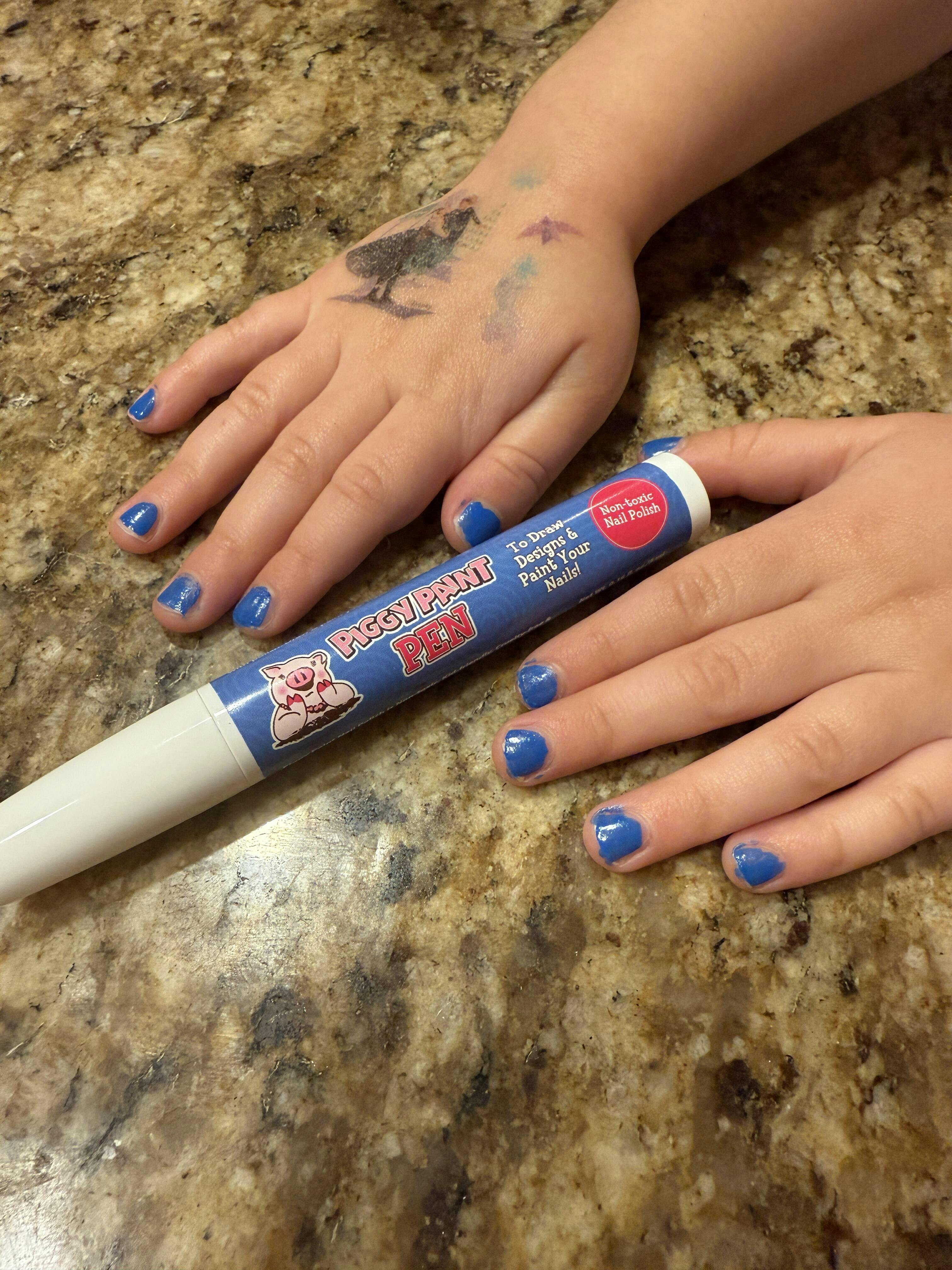 This Piggy Paint Nail Polish Pen makes it super easy and fun for kids to get creative with their nails. With its marker-like tip, kids can draw designs, add colorful details, and paint their own nails with ease. Non-toxic, Kid-friendly, Cruelty-free, and Vegan, it’s a safe and playful way to make your nails pop with personalized art! This Piggy Pen is perfect for expressing creativity, one nail at a time. ALL Fun, with NO harsh chemicals!