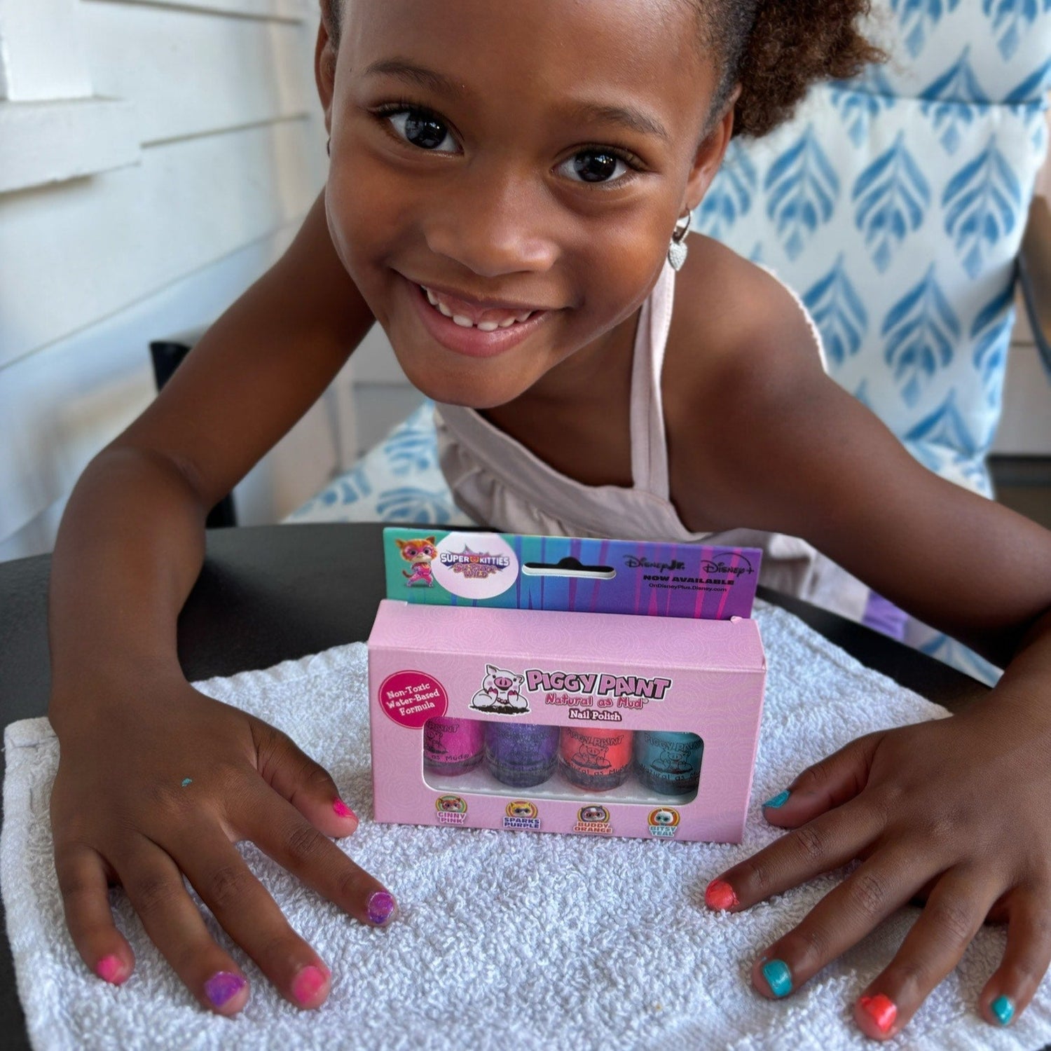 Piggy Paint nail polish is Non-toxic, Virtually Odorless, and Kid-friendly! This Advanced, Water-based formula Dries Hard - and Doesn’t Wash or Peel off. Plus, it's Safe for Babies, Toddlers, and Kids of all ages! Piggy Paint is a Premium brand that is trusted by parents (& created by a Mom!). ALL the Fun, with NO parabens, phthalates, or harsh chemicals!